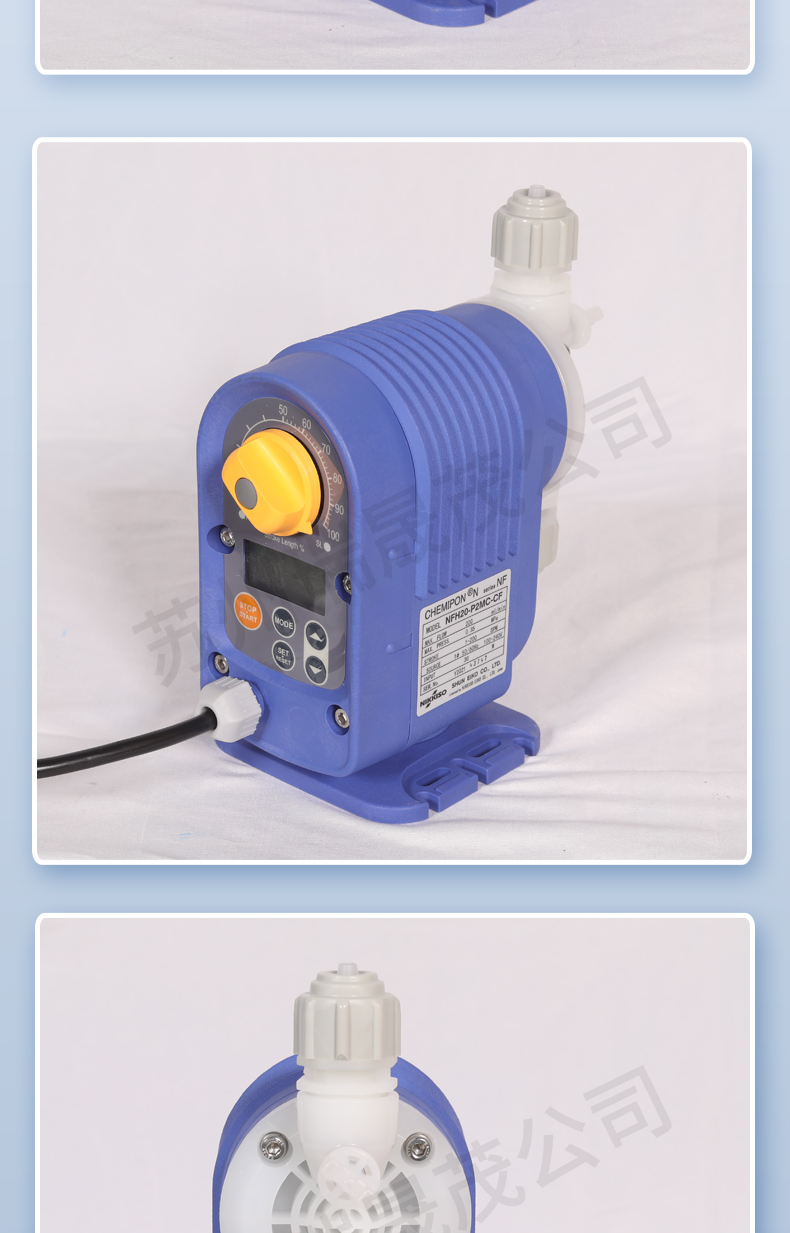 1、泵頭標準材質為聚偏氟乙烯PVDF,可對應更多種類腐蝕流體